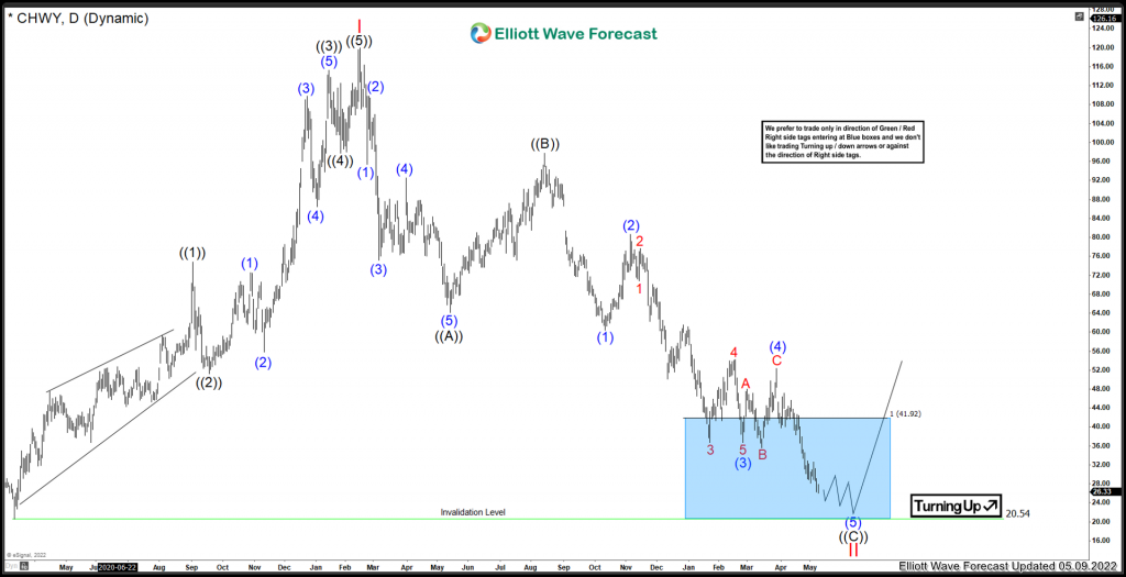 This stock made new all time highs in February 2021. After that peak, a deep correction has taken place. From the all time low @ 20.54, the stock has rallied in 5 waves and peaked in February of 2021. Medium term term view from Feb 2021 peak set @ 120.00 . The pullback since the peak over a year ago, has been a fairly clean pullback. There is a clear 5 waves down into ((A)), bounce in ((B)). As a result, the stock is declining in the final leg before a larger bounce may take place. Currently, the momentum is suggesting that blue (3) and (4) are set and as long as the 20,54 low remains intact, this instrument can still be correcting that 20.54 low.