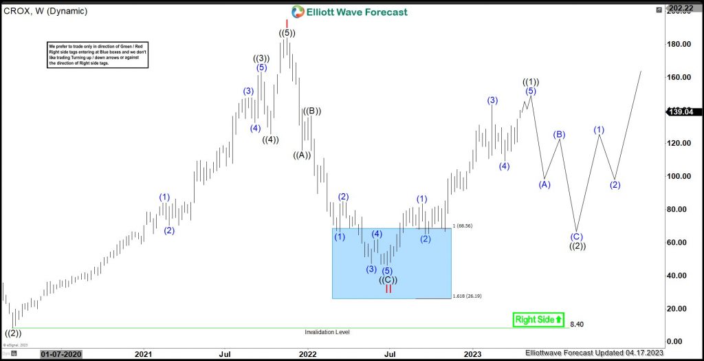 CROX ended impulse Elliott Wave sequence as wave I at $183.88 high started from November-2008 low. Below there, it proposed ended wave II at $46.08 in zigzag correction ended in blue box area. It favors higher in ((1)) of III & expects further upside before pullback starts in ((2)) correction.