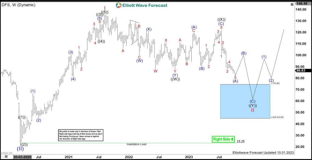 DFS ended wave I as impulse sequence at $135.69 high started from March-2020 low. Below there, it favors pullback in double correction as II & expect sideways to lower towards $74.56 – $44.90 area.