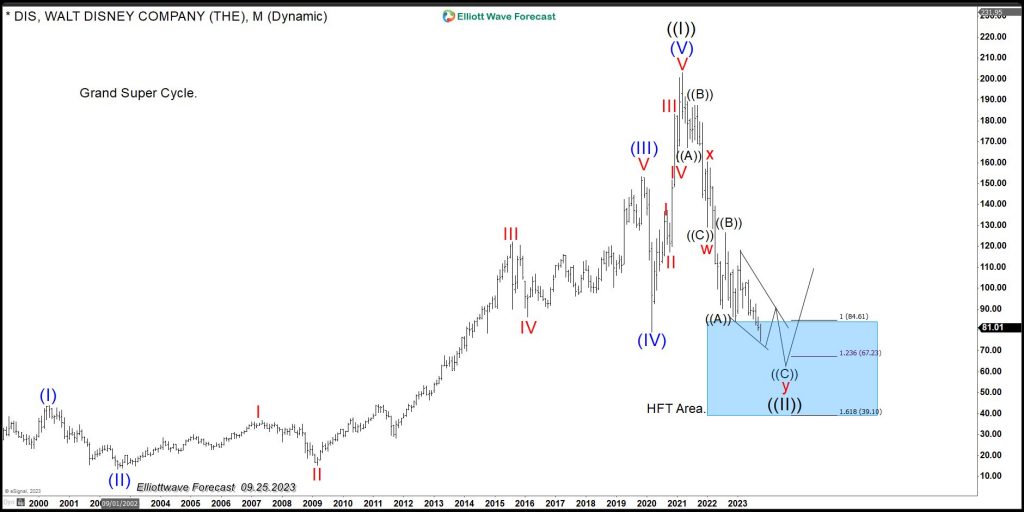 Disney has been in a tremendous decline since it peaked at $203.02 back 03.08.2021. The Peak ended a Grand Super Cycle and since then it has corrected in larger pullback. The Elliott Wave Theory provides us with cycle degrees determined by the time each cycle lasts. So the Grand Super Cycle is the highest cycle degree and can sometimes last even centuries. Here is the page that explains all the details within the Theory and provides new traders with enough guidelines to navigate the market. Let’s take a look at the Elliott Wave outlook for Disney.