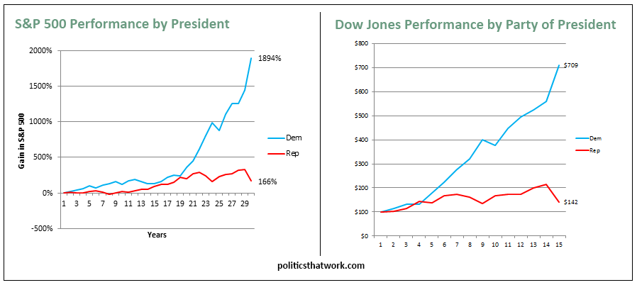 The historical outlook for the stock market combined with the Election Cycle theory shows that U.S. stocks tend to under-perform during election years and on the first year of a new presidential term equities are likely to stay below the average . However depending on the outcome of the election , the performance of the stock markets in the longer term is different as statistics based on previous elections are showing that during the period of a democratic president S&P 500 ( SPX ) & Dow Jones ( DJIA ) gained a lot more compared to the period under a republican presidents as presented in these charts .