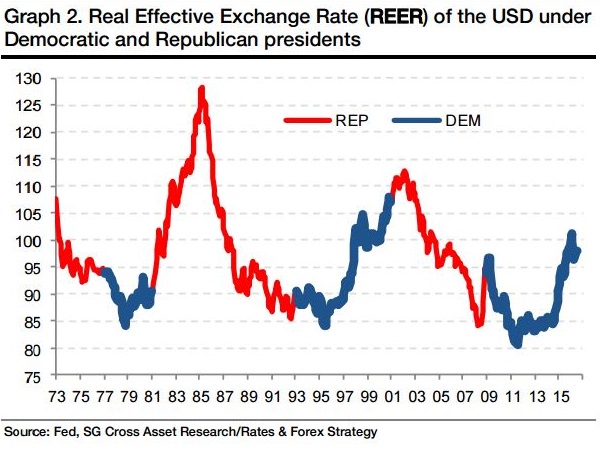 The same can be said about the US Dollar as we take a look at the next chart , most of the time USD Index seems to outperform under democratic president while it ends up at lower levels under a republican president .