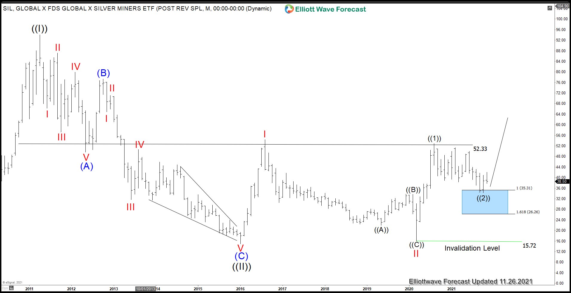 After forming wave ((2)) low on October 5 inside the blue box, the ETF has rallied in what looks like a 3 waves. It’s possible that SIL is doing an expanded Flat correction in wave 2. As long as the pullback stays above wave ((2)) low at 34.21, expect further upside. Alternatively, if it breaks below $34.21, we can count the entire decline from wave ((1)) as a Flat. In this scenario, the ETF can see 1 more push in wave 5 of (C). Either way, the daily invalidation level at $16.76 remains the key pivot and the ETF is expected to extend higher once the correction is over.