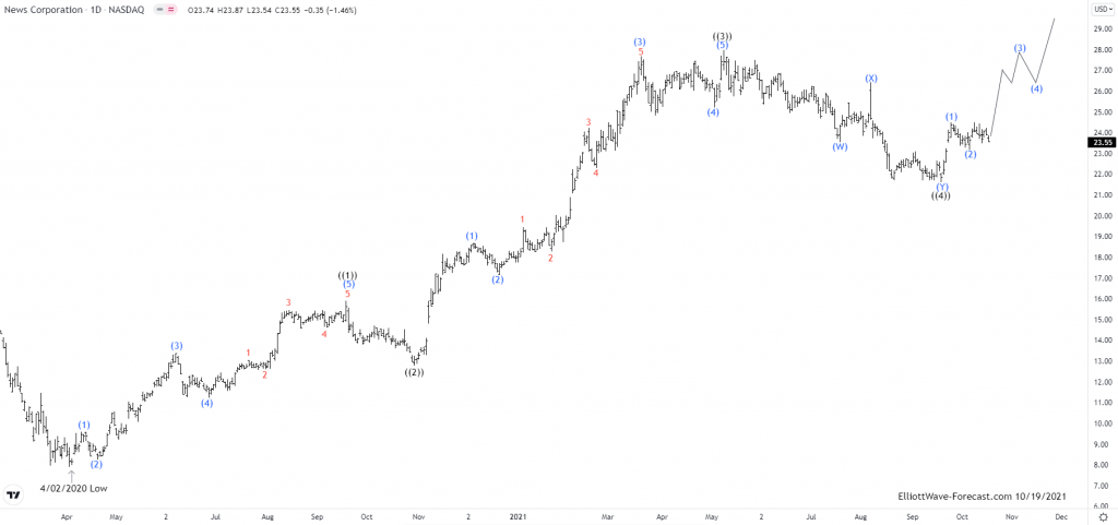 Since 2013 in daily, NWSA made all time low during Covid pandemic sell off at $7.90 on 4/02/2020. It started the impulse sequence from April-2020 low & ended ((3)) at $27.97 high on 5/10/2021. While below there it proposed finished ((4)) at $21.61 low on 9/20/2021 & above that level it expect to extend higher in ((5)) for new high above ((3)).
