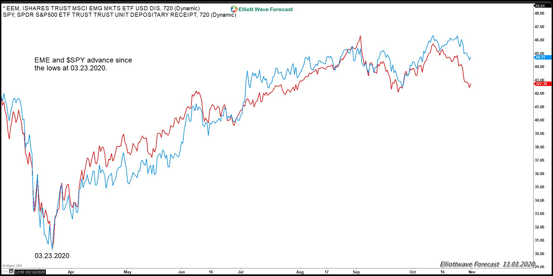 The chart above shows the advance since the lows at 03.23.2020 for EME. There’s a very clear subdivision of five waves since the lows. Although we believe a new high still can happen, we can already see a divergence, thus the cycle is mature. Chasing the move higher at this stage will need to be with a very well defined risk level. From the chart above, we believe that no matter what the result of the US General Election is, there won’t be a big rally into a wave III yet.