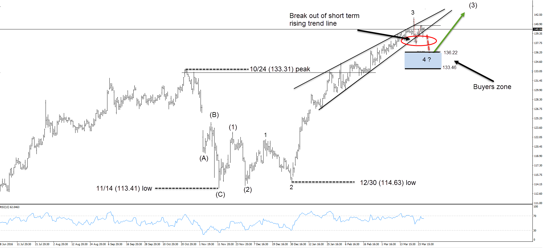 Rally to 140.76 ended wave ((x)). Wave 4 pull back can make a double correction towards 136.22-133.46 area where buyers will be waiting. From that area, a reaction higher should ideally follow in further rally or in a 3 waves bounce at least.
