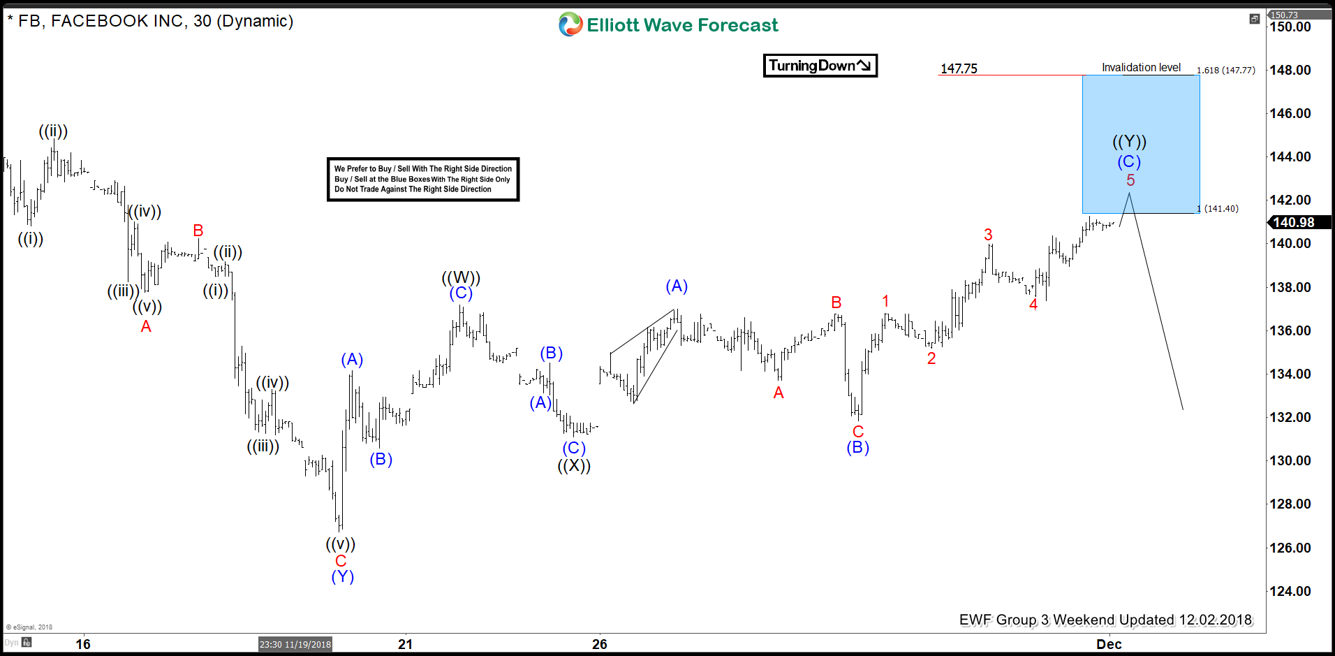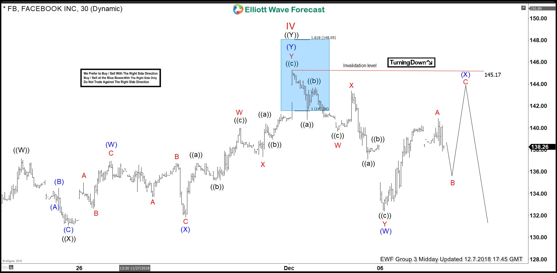 As Facebook ended the cycle from 09/27/18 peak, we expected a bounce to occur in red wave IV. Above from 11/20/18 low (128.45), the bounce unfolded in an Elliott Wave double correction structure. We advised members that Facebook ideally should continue lower. Therefore, we expected sellers to appear in the sequences of 3, 7 or 11 swings. At the 100 – 1.236 Fibonacci extension of black ((W))-((X)) which came at around 141.41-147.77 area and that was the first area for sellers to appear.
