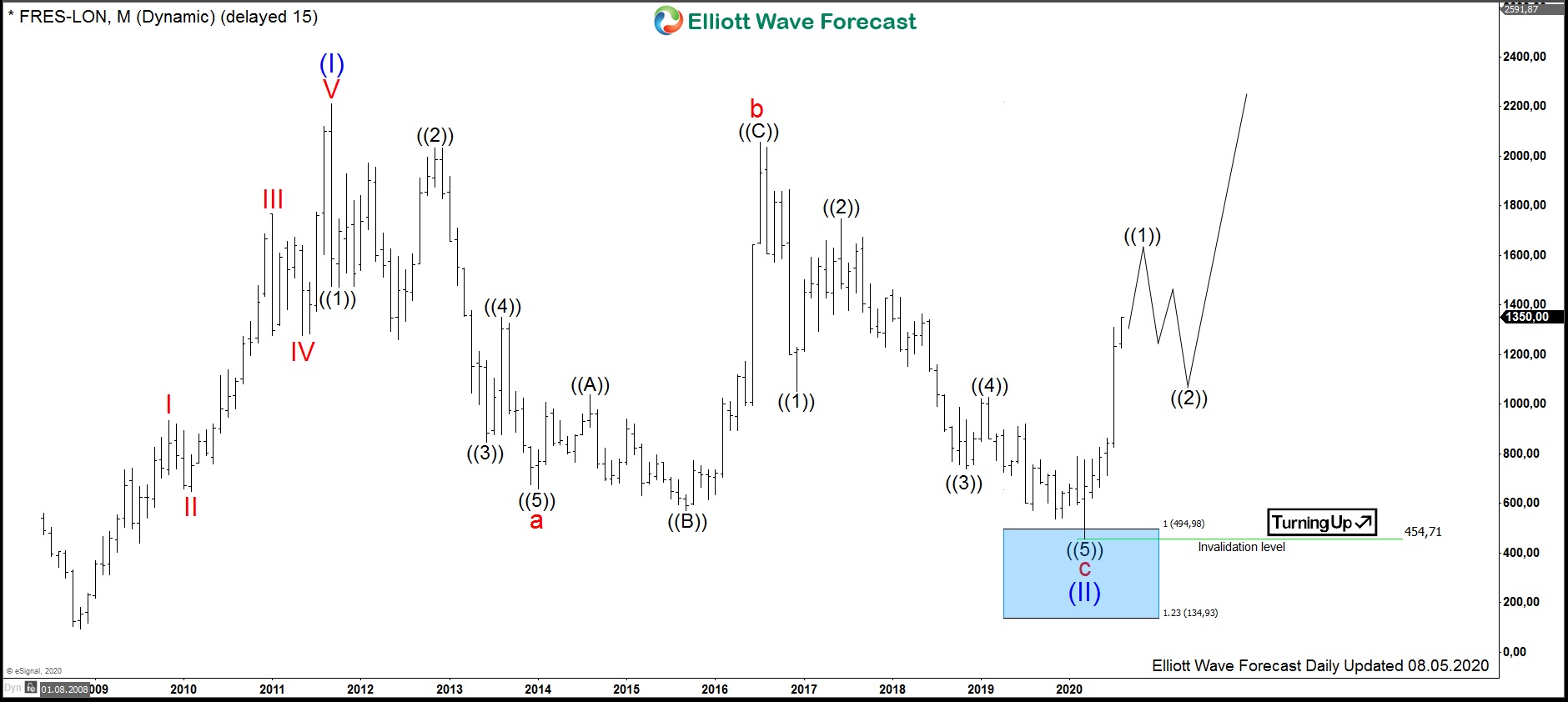 Investors and traders can obtain a good opportunity to enter the rally in $FRES at a pullback. Medium-term, a correction lower in wave ((2)) should find support above the March lows at 454.71 in 3, 7 or 11 swings. Then, an extension higher in wave ((3)) to new highs should follow or $FRES should produce another leg higher at least. As an outlook, montly target for the wave (III) is 2572-3885. Break of the 2213 level would confirm that the wave (III) is underway.