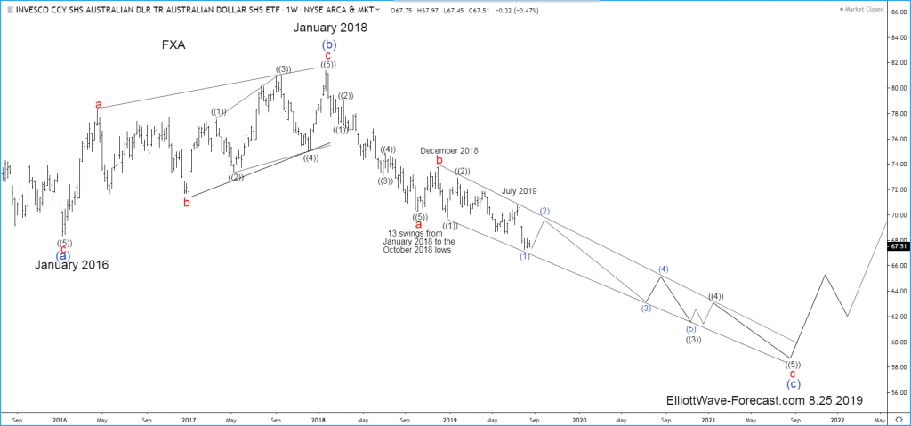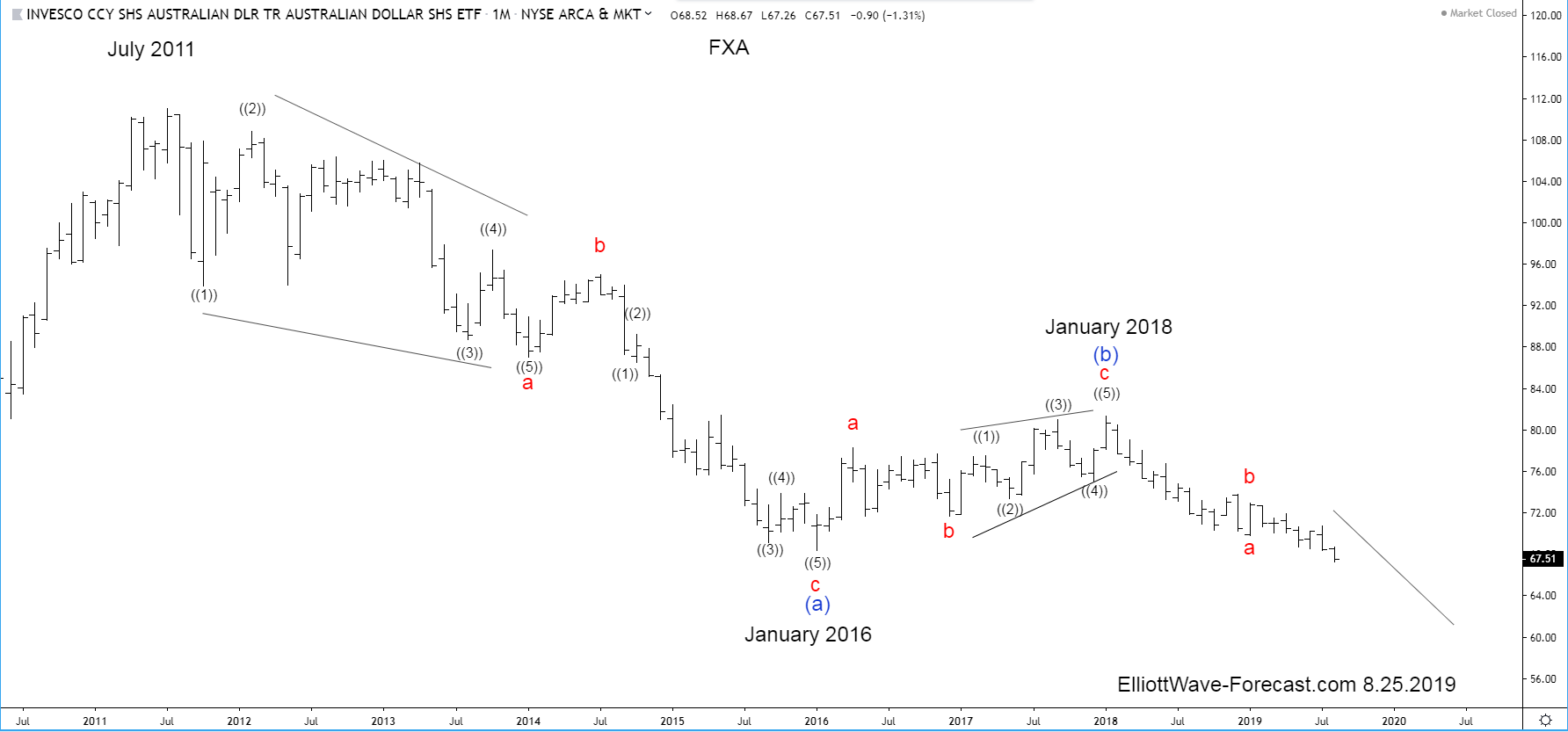 Secondly the decline from the aforementioned July 2011 highs at least in this FXA ETF fund does not seem legitimately able to count the whole cycle from there down to the January 2016 lows as a regular impulse by itself as a whole. The cycle lower in the blue wave (a) has been subdivided as an a-b-c in red. The instrument has since then bounced in three swings in what appeared to be a zig zag Elliott wave (b) that ended in January 2018.