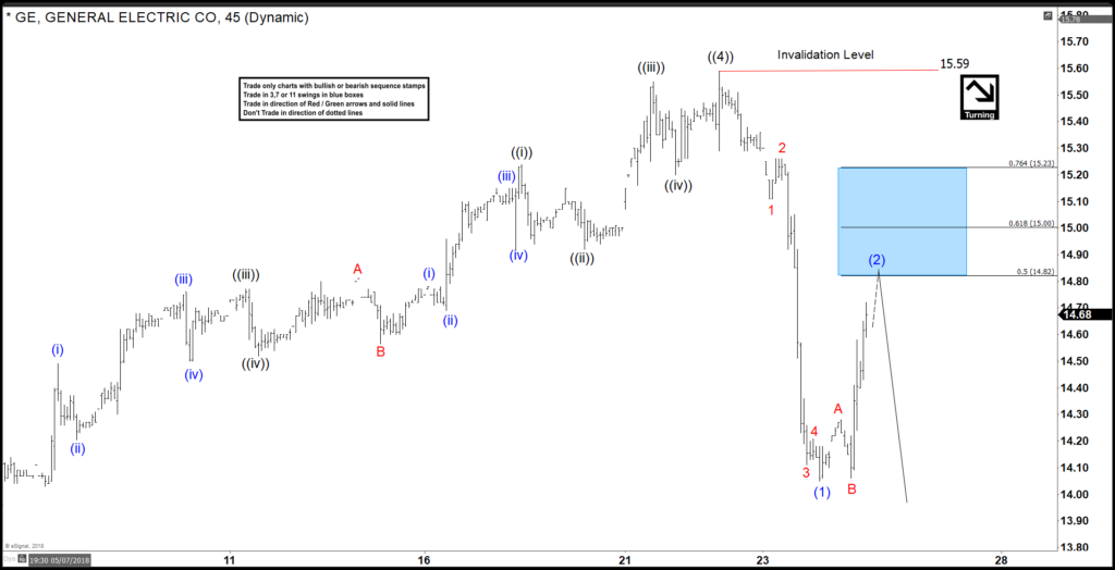 General Electric ticker symbol: GE short-term Elliott Wave view suggests that the rally to 5/22/2018 high 15.59 ended primary wave ((4)). When intermediate degree wave (Y) of ((4)) ended as a Zigzag correction with Minor wave A ended at 14.79 and Minor wave B ended at 14.58 low.