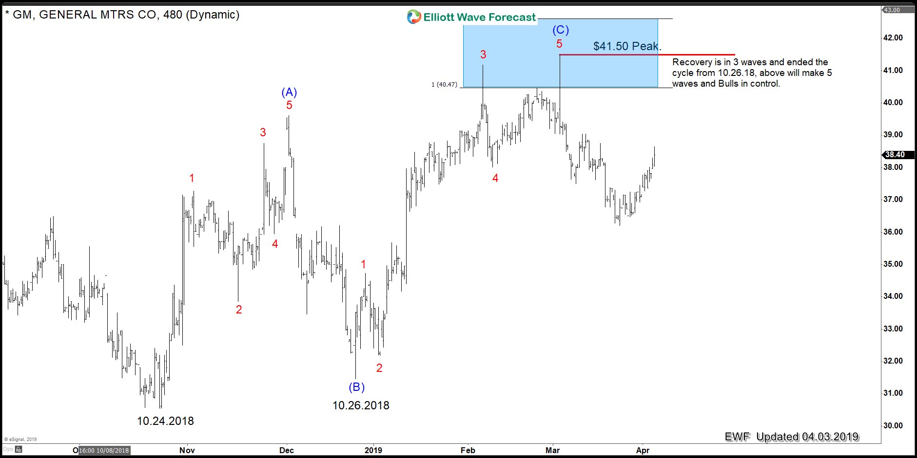 The chart is showing the price action in GM from 10/24/2018 lows. It shows our Blue Box area which comes at around $41.50 which is from its 10/24/18 low. The key is that GM needs to hold the peak at $41.50. If it breaks that peak clearly the Bears will lose control of the Market. The peak at 41.50 means that it ended a 3 waves advance structure. And a break above there will mean it becomes 5 waves from lows and consequently, more upside will be seen after a 3 waves pullback. This path would mean that the Bulls would be on the driver seat and that will translate that SPY will be ending only wave ((1)) of wave V.