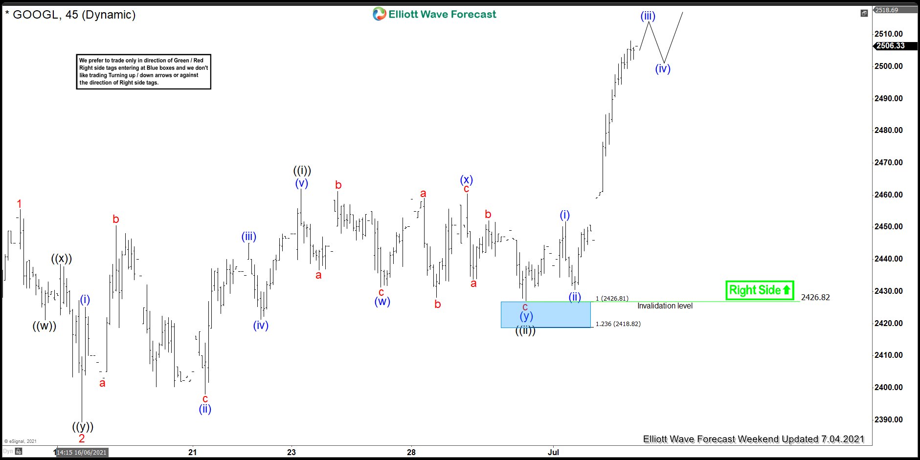 Above is the 1hr Elliott wave chart of Google from the 6/30/2021 Pre-Market update. In which, the rally to $2455.51 high ended wave (1) and wave (2) pullback ended $2389.25 low. Up from there, the stock made a new high in wave 1 above $2455.51 high & made a pullback in wave 2. The internals of that pullback was expected to unfold as a flat structure where wave ((a)) ended at $2431.30 low, wave ((b)) ended at $2460.42 high, and wave ((c)) was expected to reach $2426.81- $2405.89 blue box area. From there, buyers were expected to appear looking for further upside ideally or for a 3 wave bounce at least.
