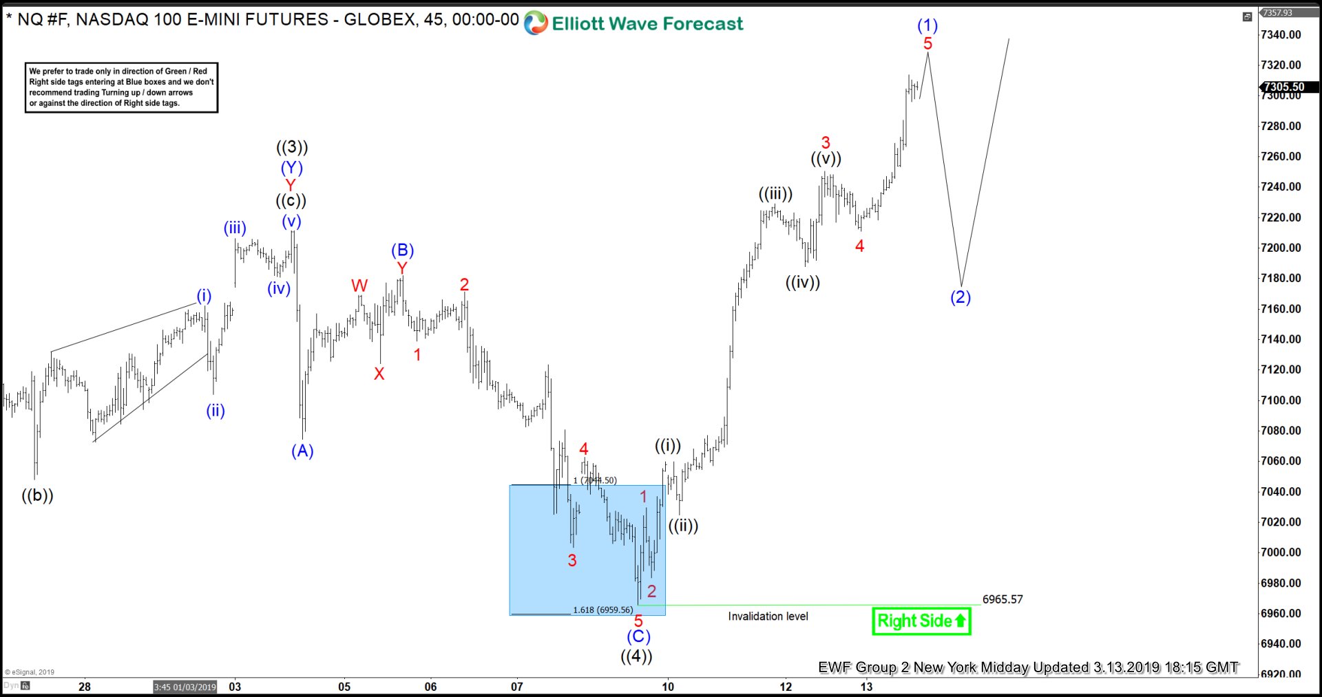 Hello fellow traders. Today, I want to share some Elliott Wave charts of Nasdaq Futures (NQ_F) which we presented to our members in the past. Below, you see the 1-hour updated chart presented to our clients on the 03/08/19. showing that the Index has a 1 Hour right side tag against 6960.56 low.