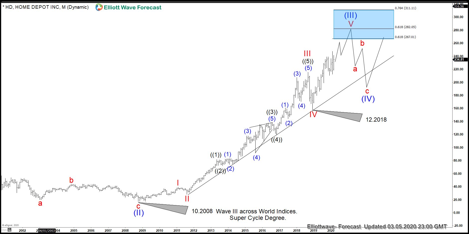 The Above chart shows the extreme area since the 2018 peak and the proposed bouncing area (the blue box). The bounce in FTSE can make some Indices and stocks to trade into new highs since 2009. We do understand that within the big market spectrum, not every Index will move and make the same highs and lows. However, they will trade together to some degree. This concept is called the second dimension, which is when the instrument agrees in swing direction, but not in overall direction. Home Depot INC (HD) for example is still trading within the 2008 cycle. Below is the monthly chart of Home Depot: