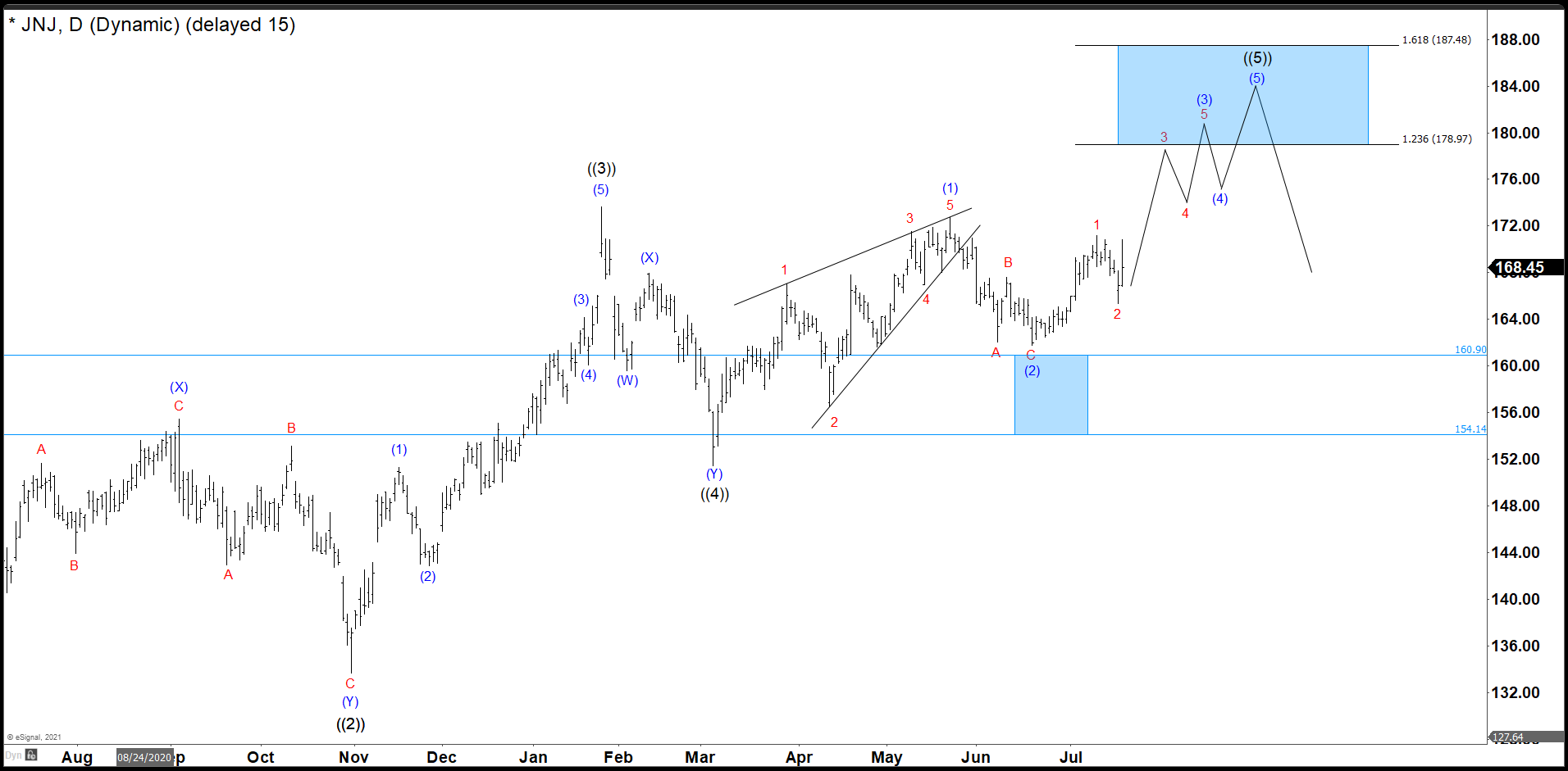 In this old chart, JNJ had a strong recovery in 3 swings. The wave ((3)) had its highest point at 173.69 rejected by the market in a double correction structure and overlapped the wave ((1)) zone to end the wave ((4)). We were expecting one swing higher to complete wave ((5)) as an Ending Diagonal. (If you want to learn more about Elliott Wave Theory, please follow this link: Elliott Wave Theory).