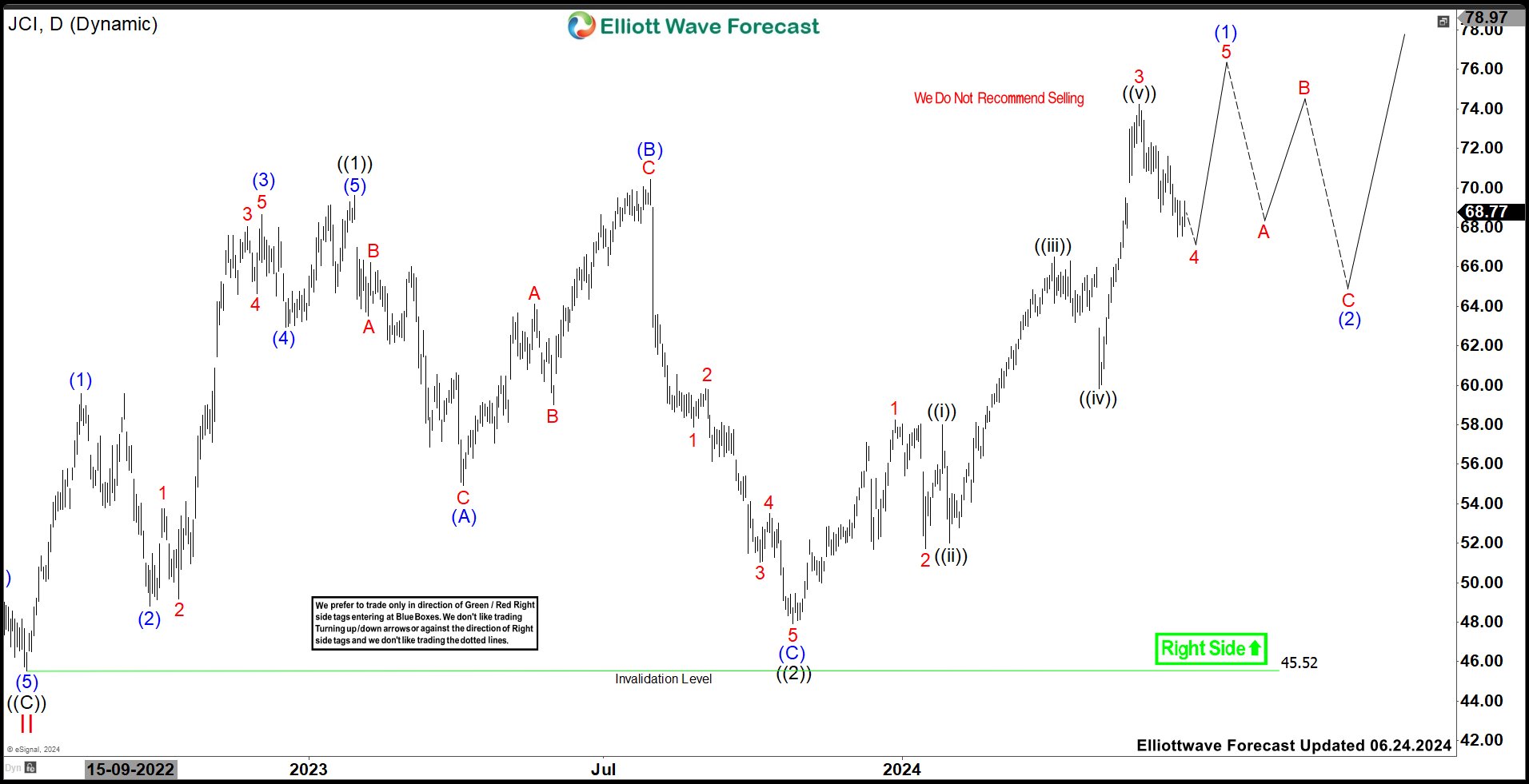 JCI favors short term upside in (1) of ((3)) against July-2022 low & expect to remain sideways to higher. Further bullish sequence will confirm when it breaks above $81.77 high.
