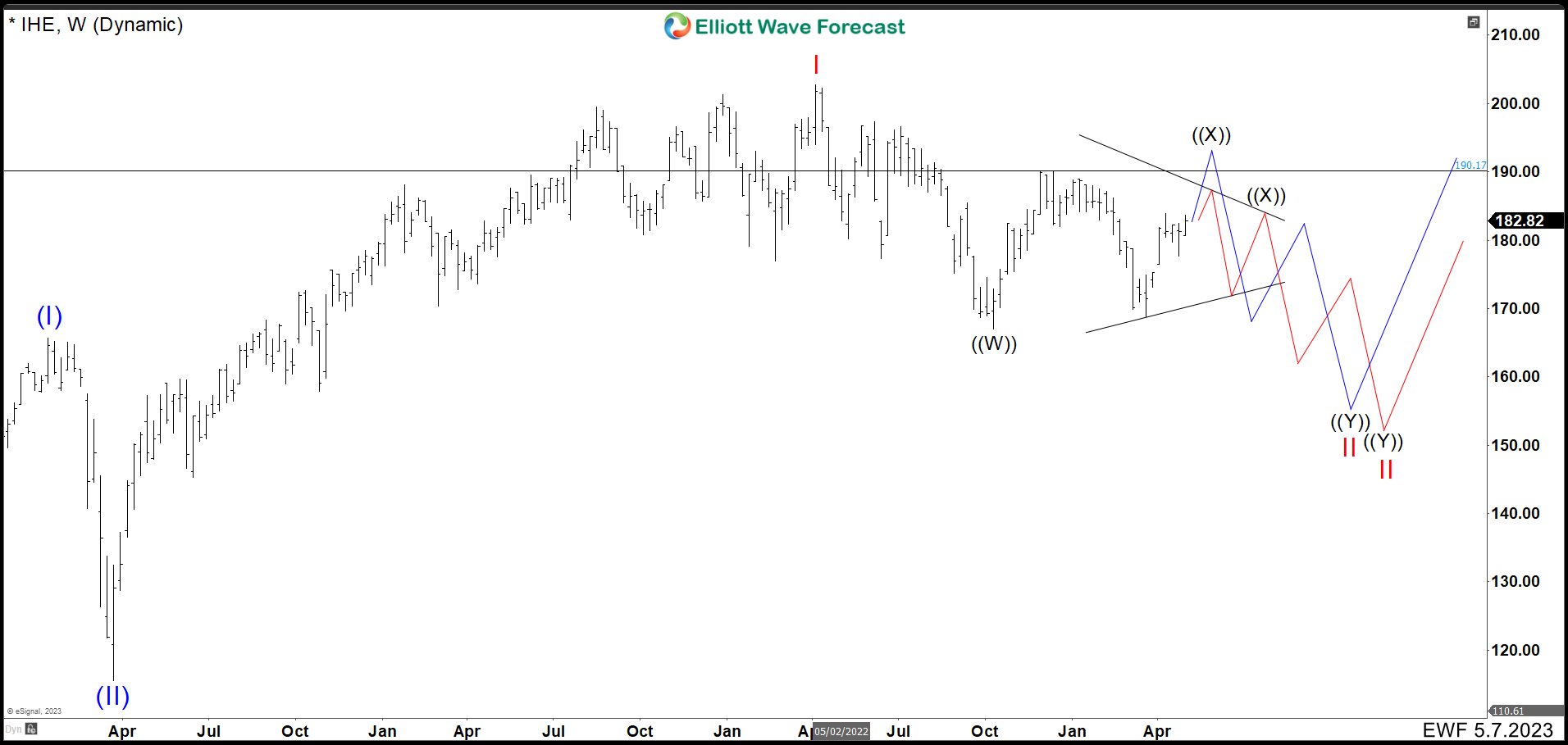 In the iShares US Pharmaceuticals ETF (IHE) chart, we can see after completing wave I the fund fell in 3 waves to end wave ((W)). From here, the wave ((X)) has two outputs. The first is for the price to break above 190.17 (blue line) to complete a flat correction. This would be the best to have a clear corrective structure before continuing lower. The other possibility (red line) is that the wave ((X)) is a triangle. The we should see more sideways movement before continuing with the higher degree correction. (If you want to learn more about Elliott Wave Theory, please follow these links: Elliott Wave Education and Elliott Wave Theory).