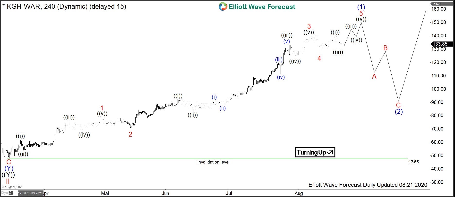 From the 2008 lows, another motive cycle has started. KGHM has broken the 2007 highs at 145 in a 5 waves move in the red wave I. Hereby, the share price has printed the all-time highs in April 2011 at 200.30. From the highs, a multi-year correction in wave II has started. Hereby, one can recognize a double three pattern. It has ended in March 2020 with a capitulation move down to 48.
