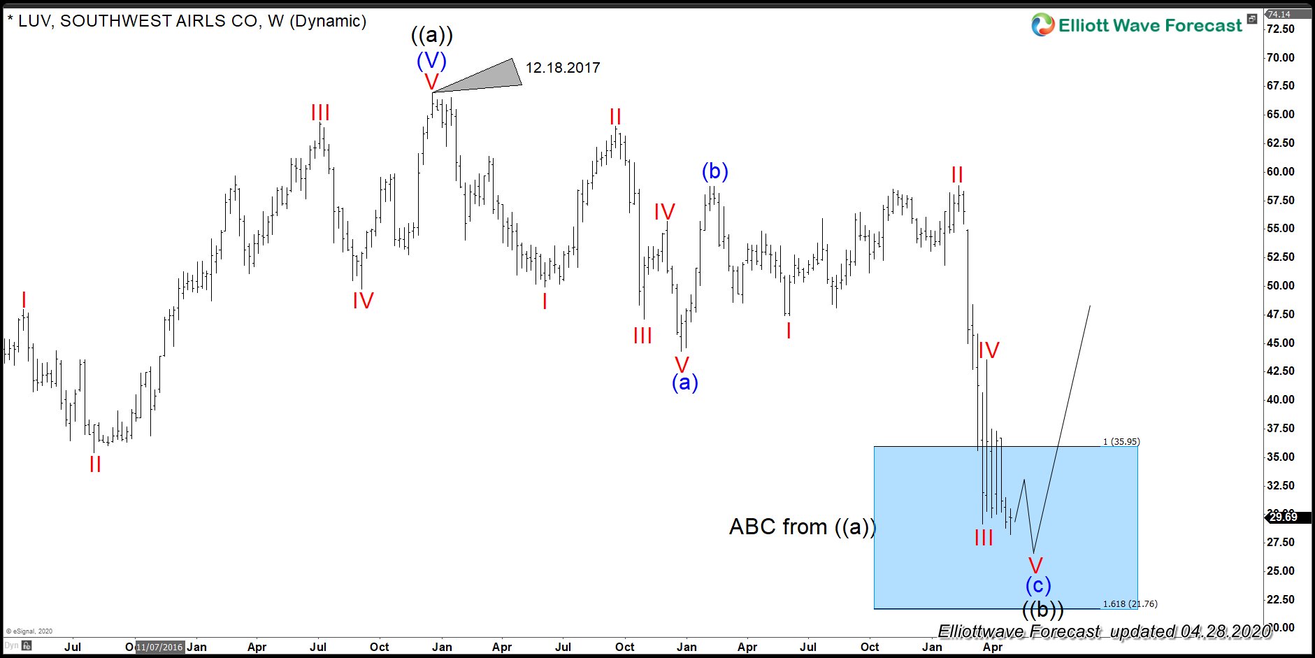 In the above chart of LUV, the stock is showing the Five waves rally and a three waves pullback is taking place. An ABC is nothing more than a two-cycle of five waves each. The impulses need to follow every single rule of the Theory. And have an impulse sequence which always is 5-9-13 area. If we take a look at the structure since the peak at 12.18.2017, at this moment, we can see how (a) Blue was a clear five waves. Then the instrument did three waves back in (b) and now we are in the process of finishing the third leg in also five waves. An ABC does not come with an extension which is the main difference with an impulse. So the ABC always ends above the 1.618%. The relationship between (a)-(b)- (c) is reflected in the following chart (Weekly) with the Blue Box area.
