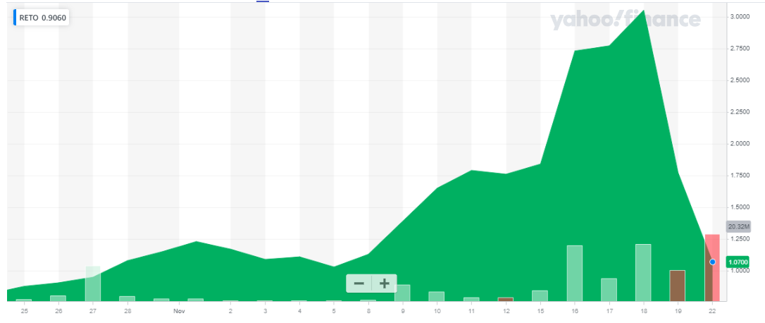 The stock of ReTo Eco Solutions has shown extreme volatility in the past month. During the last 30 days, the stock reached a peak of $3.05 and the lowest of $0.87. Within the last 30 days, the stock appreciated by more than 200% and then declined by 65%.