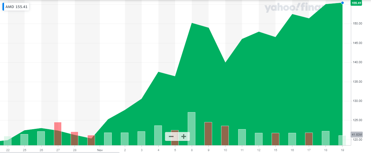 In the past 30 days, the stock price of AMD has risen from $119 to $155, reflecting a 30% appreciation. Throughout the month the stock has experienced multiple hikes and drops in price.