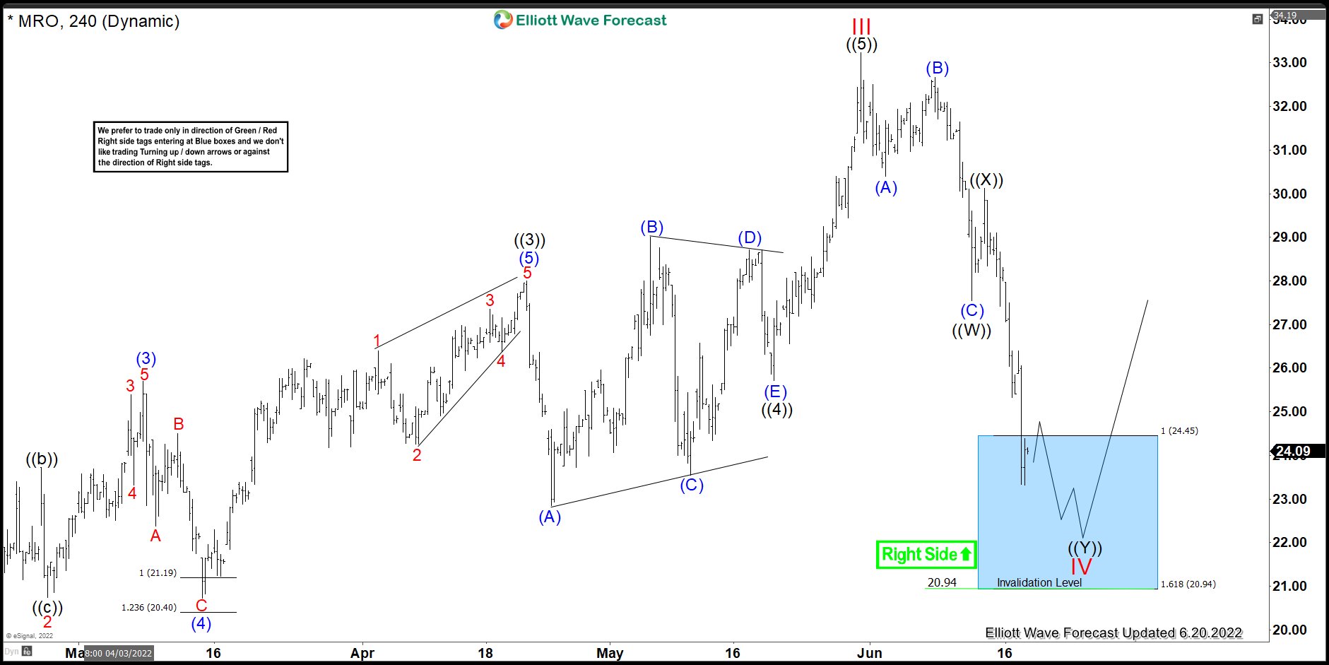 Marathon Oil Corporation ticket symbol: MRO engages in the exploration, production, and marketing of liquid hydrocarbons and natural gas. It operates through the following two segments: United States (U. S.) and International. The U. S. segment engages in oil and gas exploration, development, and production activities in the U.S. The International segment engages in oil and gas development and production across international locations primarily in Equatorial Guinea and the United Kingdom. The company was founded in 1887 and is headquartered in Houston, TX. We will look at the Elliott wave analysis below: