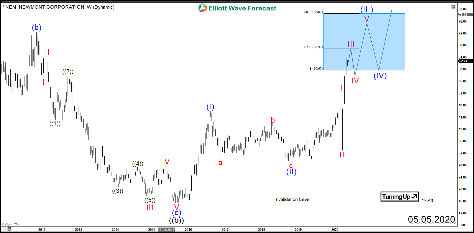 The next rally for NEM will depend on how deep the pullback will be. If the correction lower overlaps with the previous wave I peak $52.7 then the most probable scenario will be a bullish nest to take place. If the pullback only correct 23% – 38% of the previous rally without an overlapping structure then the stock could be doing a wave IV pullback which will also support another rally as a wave V within a regular impulse since 2015 low. Both scenarios are suggesting further gains for the mining stock as Gold price is expected to remain supported and break above 2011 peak in the Future.