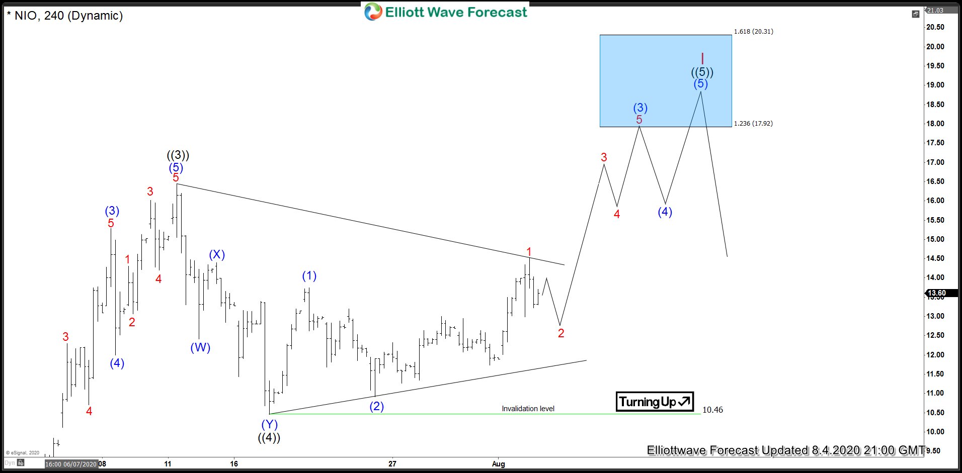 NIO decline from wave ((3)) high was in 7 swings and appears to have completed wave ((4)) at $10.46. As dips hold above $10.91 and more importantly above $10.46, we are expecting wave ((5)) to continue higher toward $17.92 – $20.31 area to complete wave ((5)) before profit taking takes place and some sellers enter the market to create a downward reaction.