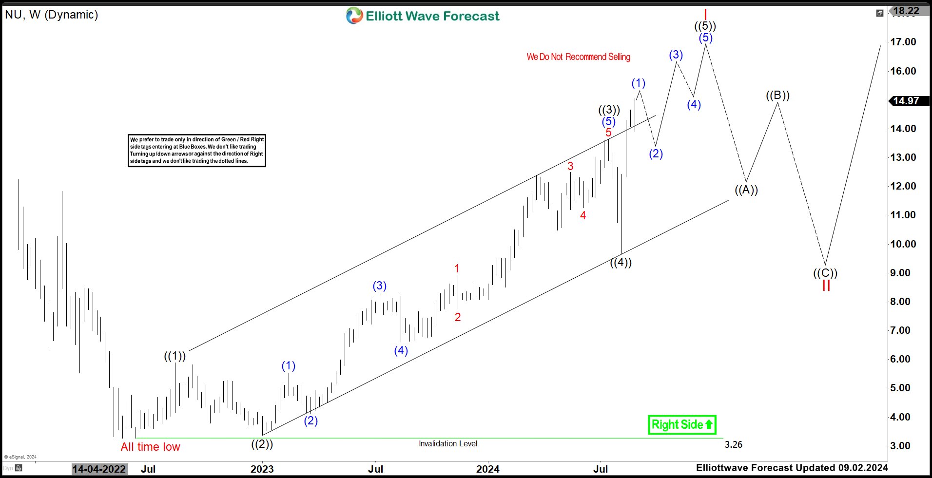 NU ended I sequence at $16.15 high as showing in the previous article. It ended ((5)) in diagonal structure started from August-2024 low. Below $16.15 high, it should pullback in II correction in 3, 7 or 11 swings against June-2022 low.