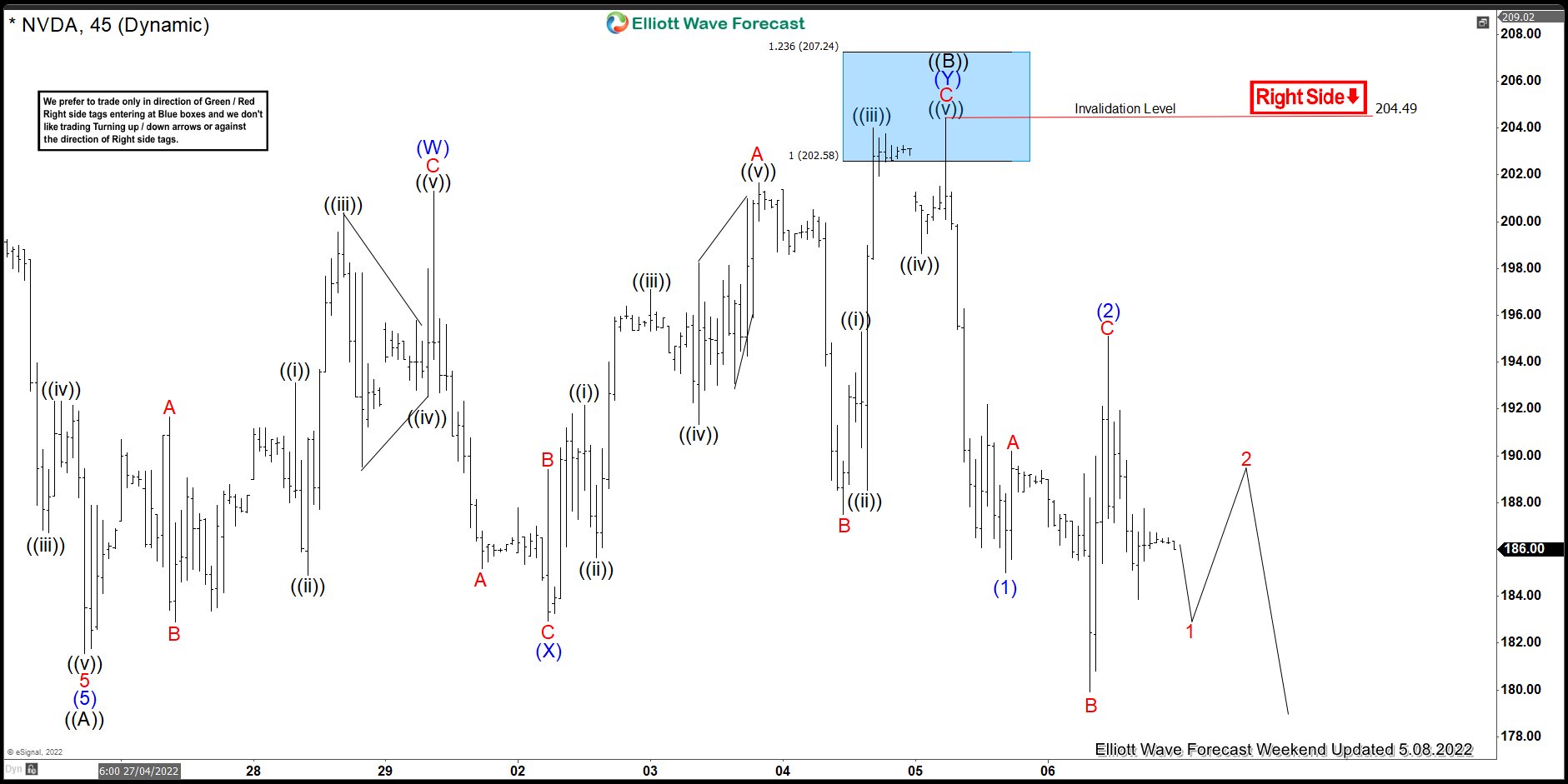 This is the 1hr view from the 5/08/2022 Weekend update. In which the stock is showing a reaction lower taking place from the blue box area allowing shorts to get into a risk-free position shortly after taking the position. Since then, the stock managed to see a break below $181.56 low confirming the next extension lower. However, it’s important to note that with further data we were able to adjust the structure of the bounce to a double three structure.