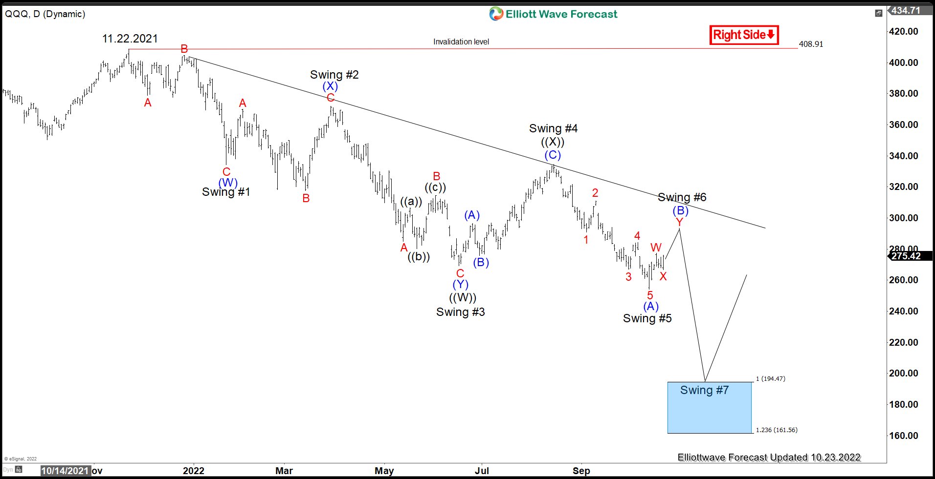 Daily Chart of QQQ (ETF tracking Nasdaq-100 Index) shows that it has a bearish sequence from 11.22.2021 high. Structure of the decline is in a double three Elliott Wave structure. Down from 11.22.2021 high, wave (W) ended at 334.15 and wave (X) rally ended at 371.83. The ETF then extended lower in wave (Y) towards 269.28 which also completed wave ((W)). Wave ((X)) rally ended at 334.42 and the ETF has resumed lower. Wave ((Y)) is now in progress and should reach 100% – 123.6% at 161 – 194 area before buyers appear for a new leg higher or 3 waves rally at least. We continue to prefer the long side in 3, 7, or 11 swing.