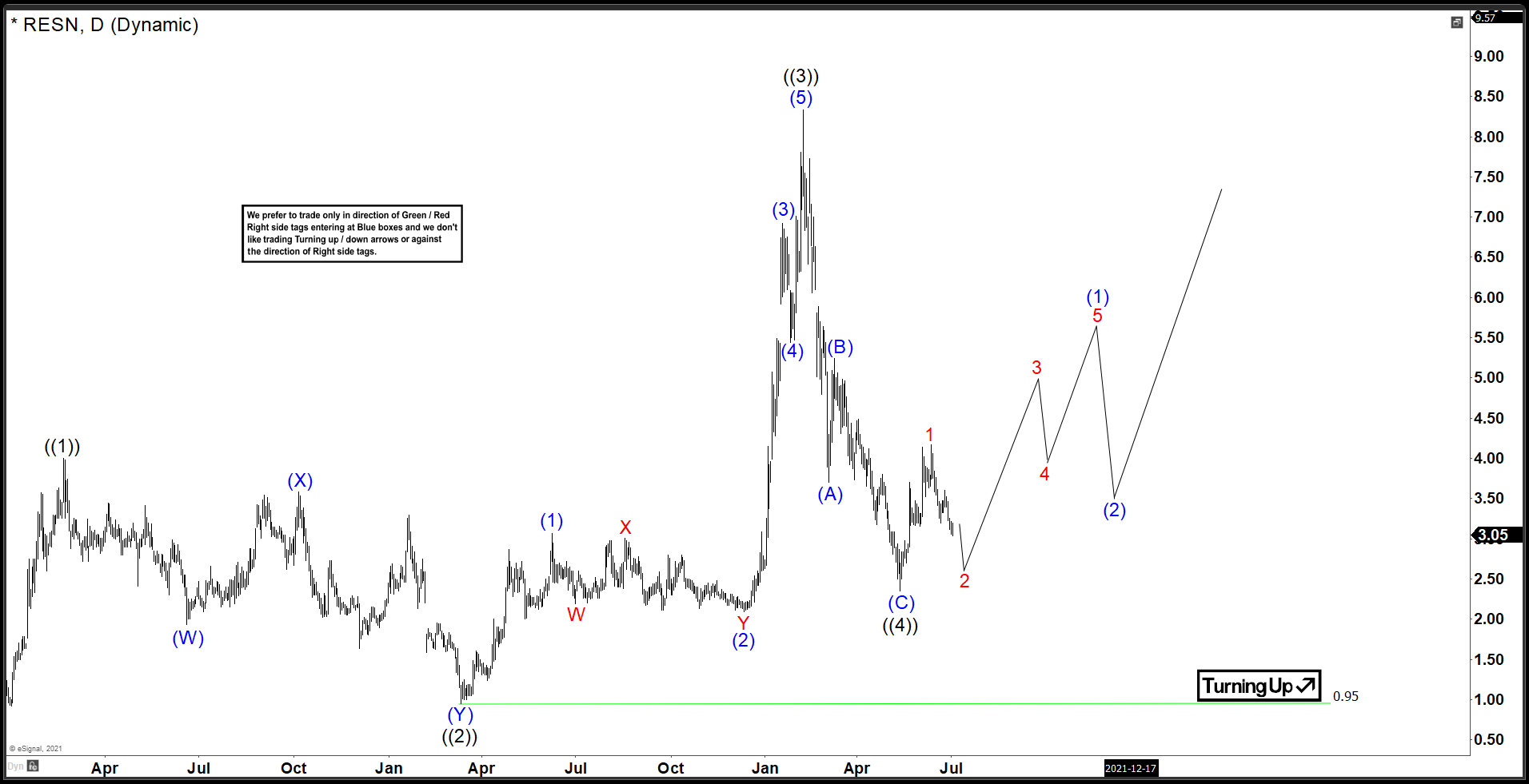 Elliottwave view from the all time low set in December 2018. From that low the stock rallied into a ((1)) which peaked in Feb 2019 @ 4.00. After ((1)) peaked, the stock had a very lengthy wave ((2)) correction. This correction took place as a double zig zag. ((2)) found a low at $0.95 on March 12/2020. From there the stock enjoyed an impulsive rally which peaked on Feb 9/2021 at $8.33. After that, a sharp correction has taken place which has overlapped on the previous ((1)) wave. This means the stock is taking shape as a leading diagonal structure within Red I degree. ((4)) found a low at $2.35 on May 13/2020.