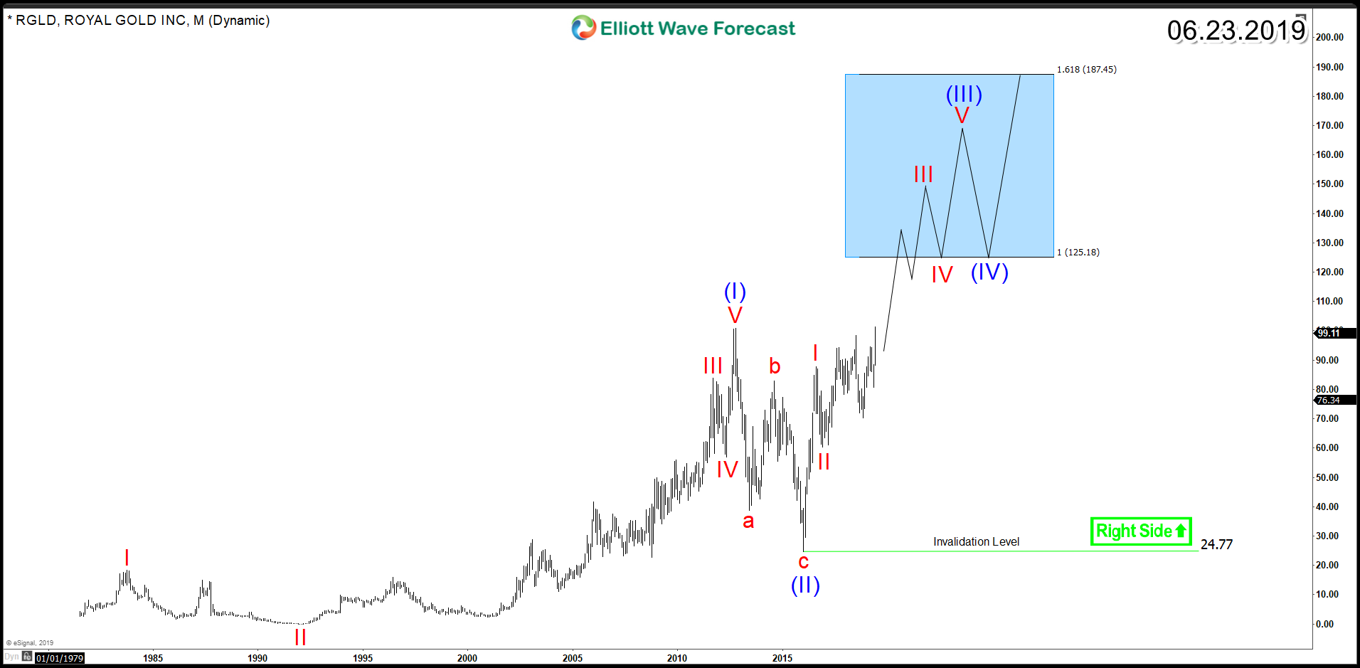 The cycle from all time lows in RGLD is unfolding as an Elliott Wave 5 waves impulsive structure and with the recent move higher it confirmed a new multi-year bullish sequence with a minimum target at $125 and further extension around $187 as the stock is nesting higher in the strongest leg wave (III).