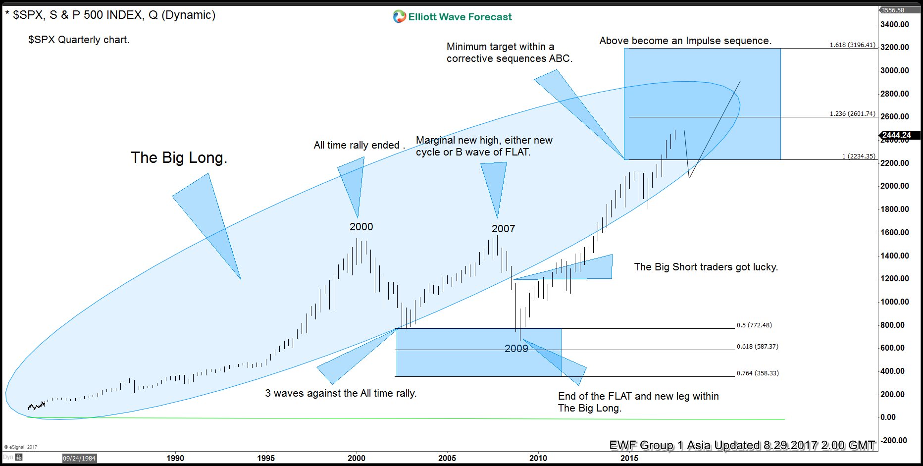 The 2009 decline was impulsive and it broke below October 2002 low. Sentiment was very negative at that time and no one was talking about buying the Index. What people don’t realize is that the Market is a reflection of human progress and thus it will never go back to zero. Correction is natural and allows the market to reset. The Market ended a 3-3-5 Expanded Flat Elliott Wave structure in March 2009 and then began the Big Long. Interestingly, nobody is filming or talking about the Big Long, and nowadays most people still talk about the impending big crash almost every single year even when the market keeps rallying. Almost nobody is talking about how great the move higher is as people don’t understand the primary trend in the human nature is higher.