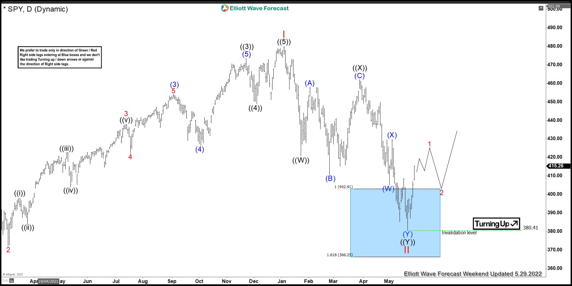 Here’s Elliott wave Chart of SPY from the 5/01/2022 update. In which, the rally to $479.98 high ended the cycle from the 23 March 2020 low & made a pullback. The internals of that pullback unfolded as Elliott wave double three structure where wave ((W)) ended in 5 waves at $420.76 low. Then a bounce to $462.07 high ended wave ((X)) as a flat & started the next leg lower in wave ((Y)) towards $402.91- $366.25 blue box area. From there, buyers were expected to appear looking for new highs ideally or for a 3-wave bounce minimum.