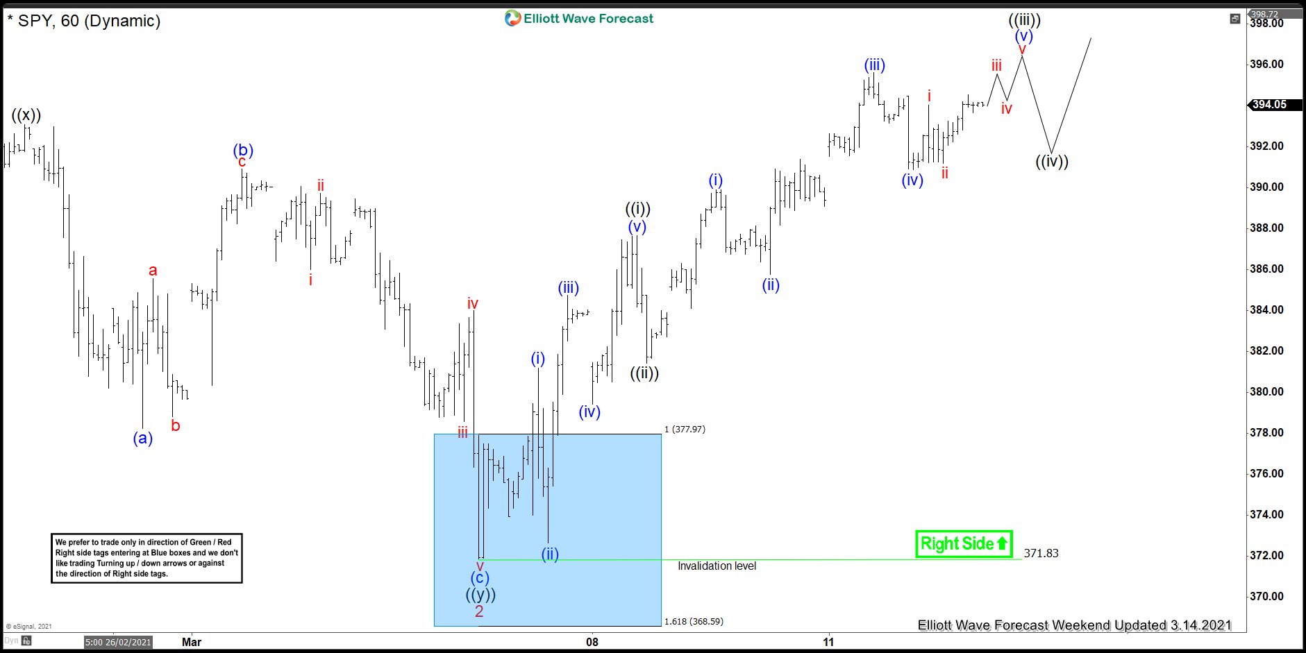 Here’s the 1 Hour Elliott wave Chart of SPY from the 3/14/2021 Weekend update. In which, the ETF managed to reach the blue box area at $377.97- $368.59 & showing a strong reaction higher taking place from the blue box area. Right after ending the double three correction within the blue box area at $371.83 low. And breaking to new highs as expected. Allowed members to create a risk-free position shortly after taking the long positions at the blue box area.