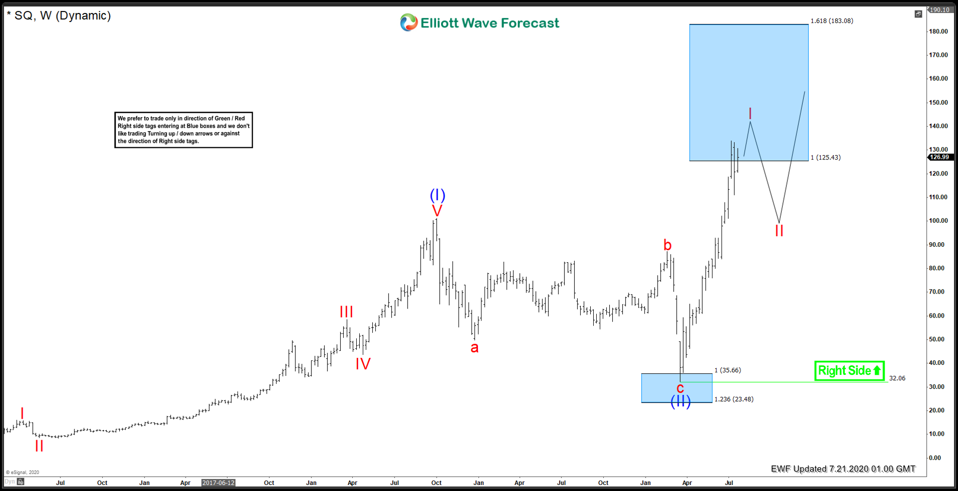 On a longer term view, Square shows a complete 5 waves sequence into the 2018 peak. From the Blue (I) top in 2018, Square is favoured to have set an abc structure for Blue (II), which bottomed in March 2020 with the rest of the general market. It has since gone to make new all time highs off that low which gives it a bullish sequence. In the longer term view, a Red I high is favoured to materialize in the months ahead, before a deeper retrace for Red II. Before that happens though, there is more upside favoured to take place to complete the cycle off the March 2020 low. Currently, prices are within the blue box extreme on a weekly view, this is an area that buyers can take profits for a pullback in 3,7 or 11 swings.
