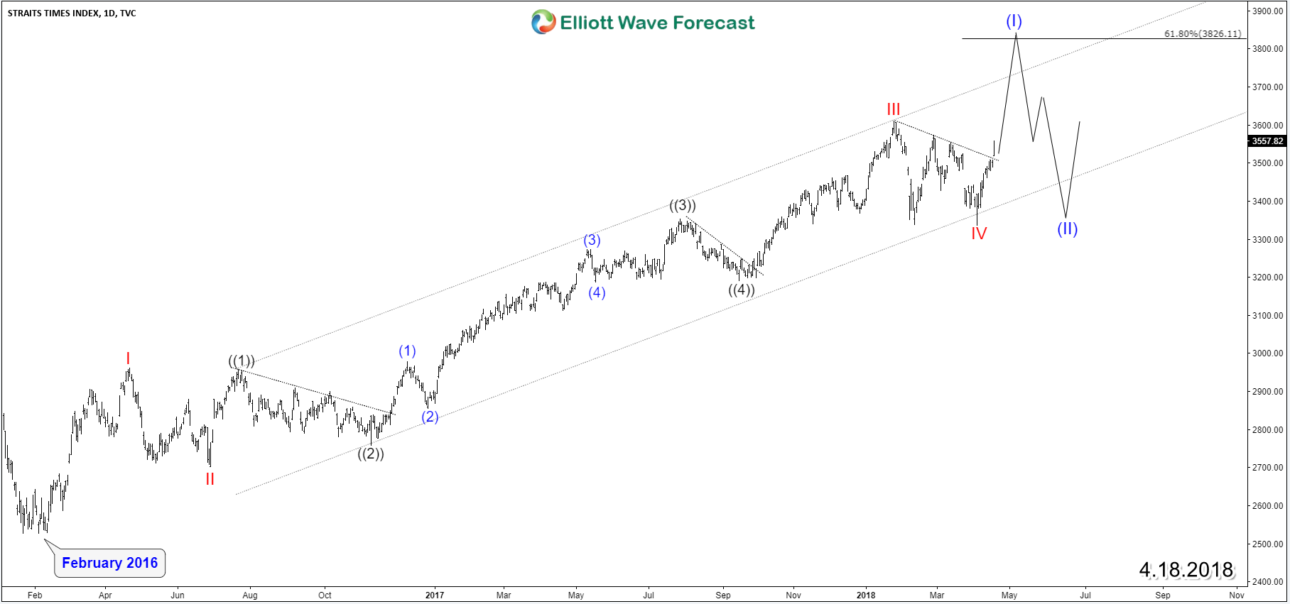 Straits Times Index is showing an Elliott Wave bullish structure from 2016 low supporting more upside around the global stock market and despite the instrument still needs to break to new highs to confirm the next leg higher, there is still more scenarios can be taking place later on depending on the structure of the move.
