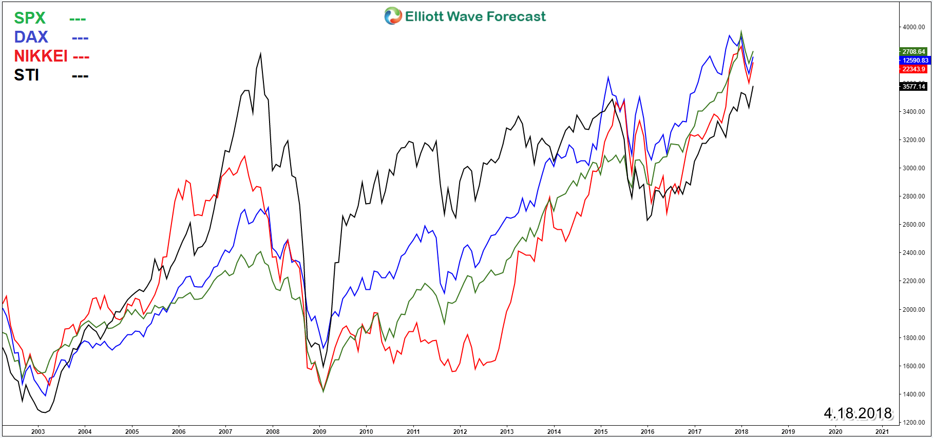 Since the 2008 Financial crises, the majority of indexes around the world recovered and made new all time highs and the cycle fro; 2009 is still in progress despite the media keeps calling for a big crash. In the next Chart, we’ll apply the Elliott Wave Theory on Straits Times Index to identify the current structure taking place.