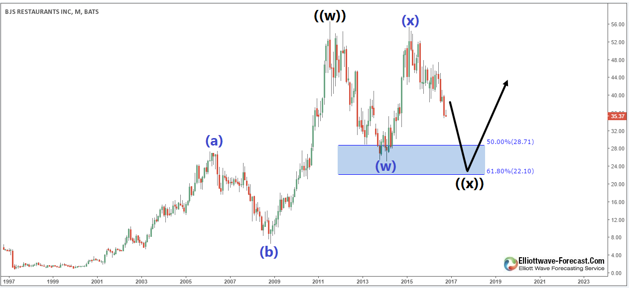 Technical analysis of BJRI is showing that the stock is still in a corrective mod since making the 2011 peak $56.64 , it already bounced from 50%-61.8% Fibonacci retracement area of the all time rally from 1997 lows but it failed to break to new highs opening the possibility for a double three correction toward $23.8 – $22.1 area before resuming higher.