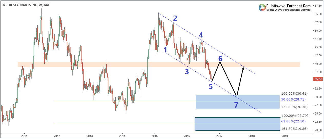 To make a conclusion , if you are trading the stock market in both direction you may want to look for short opportunities in BJRI in the 6th swing pullback for a move lower but if you are the investor type who just buys then holds for years you need to wait for the stock price to reach the blue box area $30.4 – $19.9 in 7 or 11 swings before you can look for buying opportunities .