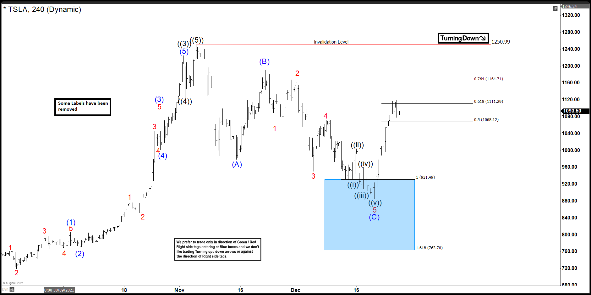 This is the latest 4hr Elliott wave Chart, in which the stock is showing a reaction higher taking place from the blue box area at $931.49- $763.70. Right after ending the zigzag correction within the blue box area. Allowed members to create a risk-free position with the minimum reaction higher towards 50%- 76.4% Fibonacci retracement from the peak. However, a break above $1250.99 high is still needed to confirm the next extension higher & avoid double correction lower.