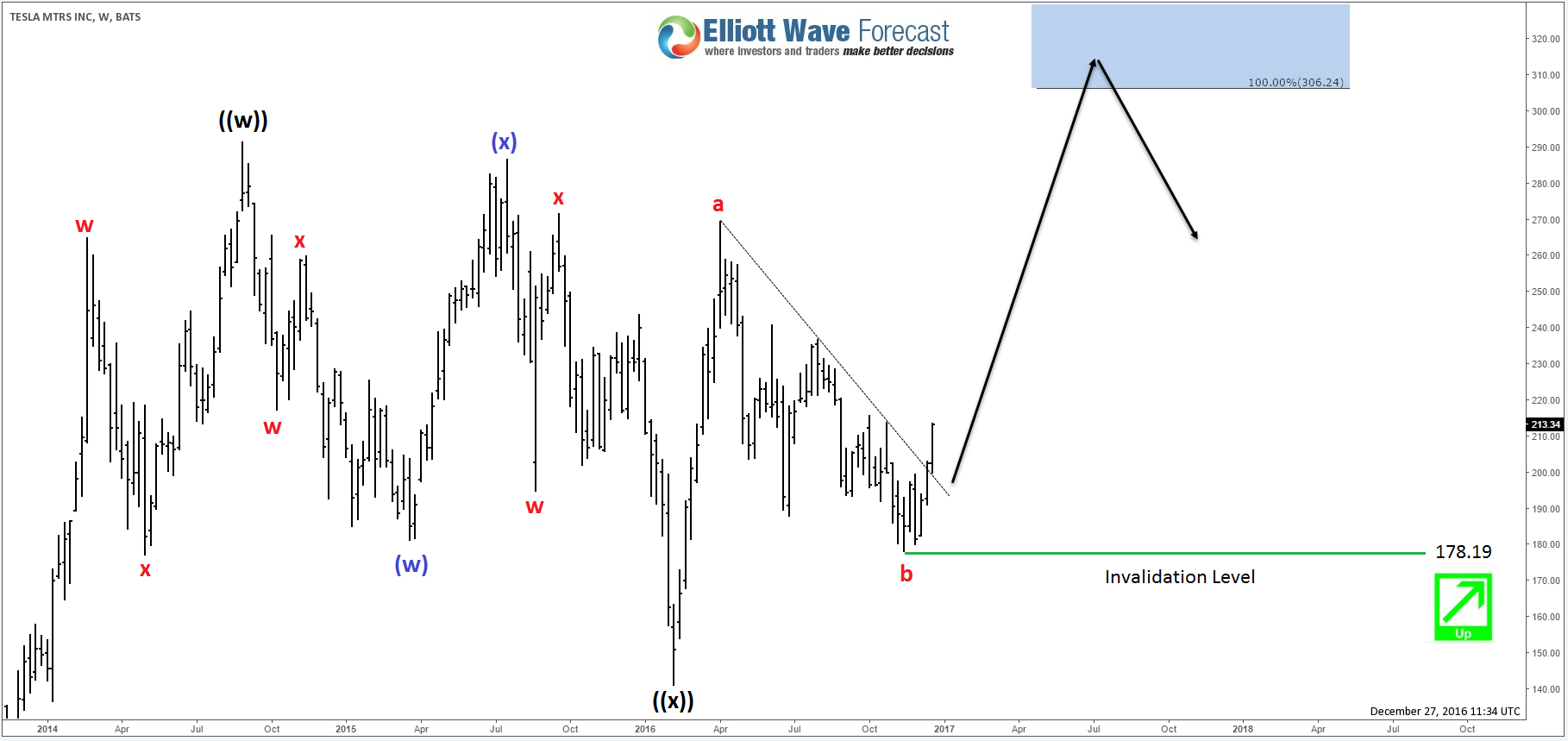 TSLA ended the correction from 2014 peak in wave ((x)) pullback after a dip in February 2016 and since then the stock is proposed to have resumed its uptrend move which needs a break above $291 to confirm the bullish sequence. Last week , the stock broke above the April trend-line meaning that wave b pullback , which missed its equal legs at $170, is done at $178.19 low so while the stock remains above that level it’s expected to trade higher looking for a first target around $306 area . Consequently, if you are interested in having Tesla in your portfolio , you should be looking for a buying opportunity in the shorter time cycles when the stock makes makes 3 , 7 or 11 swings pullbacks against the November low $178.19.