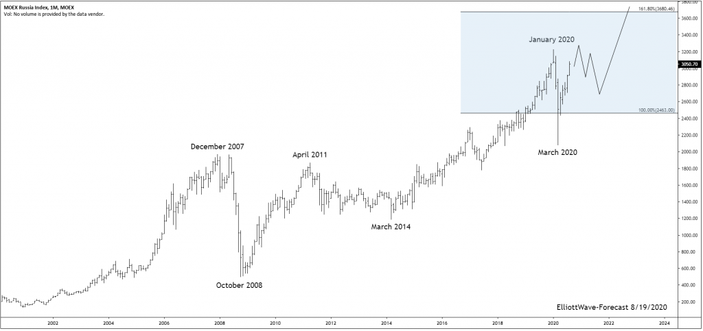 Firstly from the October 2008 lows the index rose into the April 2011 highs. Then the index saw an almost 3 year long correction of that cycle into the March 2014 lows. That pullback corrected the whole cycle up from the 2008 lows. From there to the January 2020 highs reached the blue box highlighted Fibonacci extension area. This is a typical area where the second cycle with the tread reaches. This area was defined by measuring a Fibonacci extension from the beginning level zero up to the December 2007 high down to the October 2008 low.
