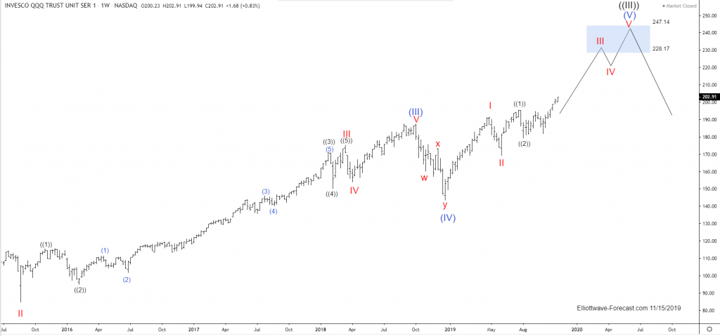 In conclusion the move up from the December 2018 wave (IV) lows appears to be incomplete. The target area figures on the weekly chart blue box represents the equal legs of the wave I & II of the cycle up from the December 2018 lows which is 228.17 As shown the 247.14 number represents the Fibonacci extension 61.8% of the cycle up from the October 2002 lows. Afterward the instrument can see a pullback lower of the same magnitude as like in the March 2000 to October 2002 lows in wave ((IV)) before turning higher again.