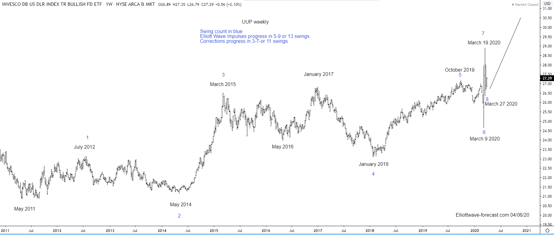 Thirdly and in conclusion, the swing and Elliott Wave count suggests further upside in the dollar. March 2020 has seen some fast 6th, 7th & 8th swings. The dollar is bullish while near term dips lower show they will remain above the March 9 2020 lows, more ideally the March 27 2020 lows. It can see further strength higher toward the 30.96 area before a significant turn back lower.