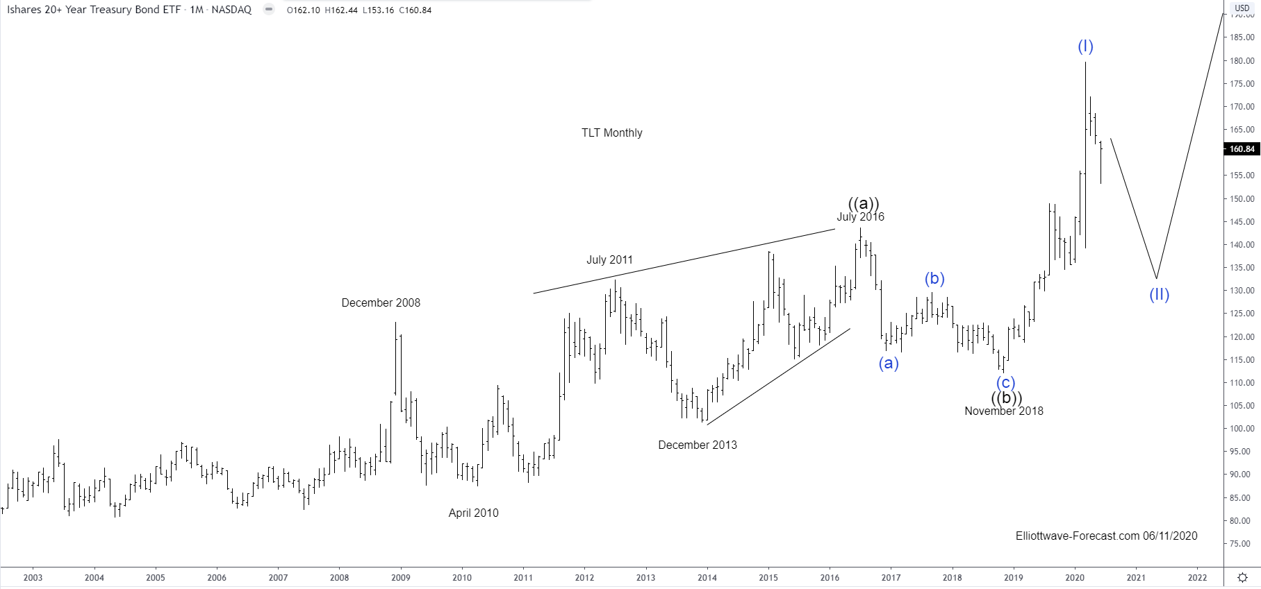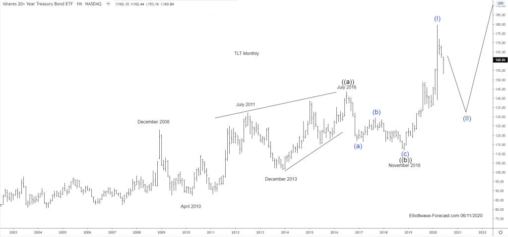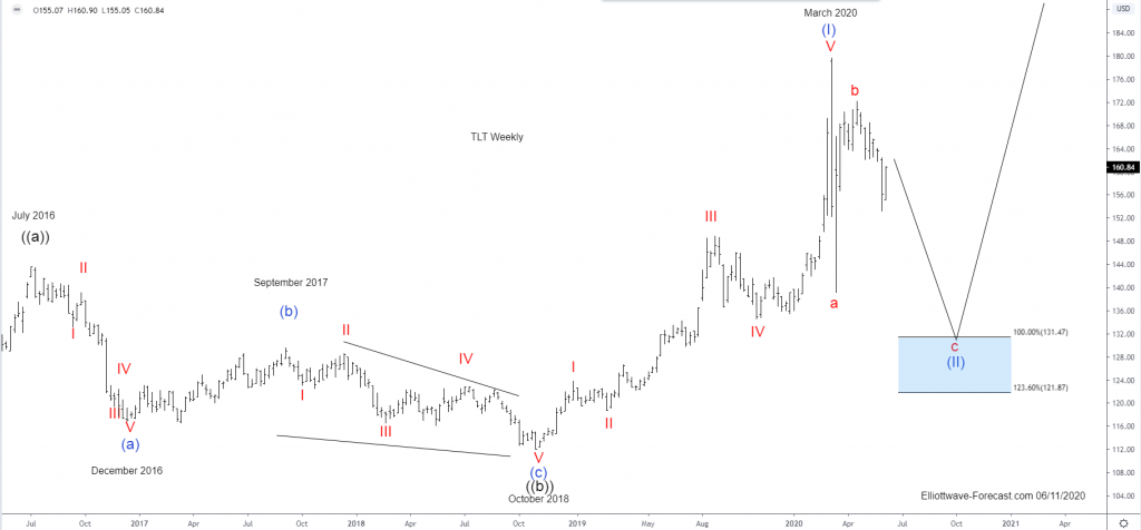 Firstly the ETF fund TLT inception date was on July 22, 2002. This instrument seeks to track the investment results of an index composed of or in U.S. Treasury bonds with maturities twenty years or more remaining. There is a lack of data before July 22, 2002. This is established. This article will focus on the larger uptrend cycle from there which is presumed finished a cycle higher from those lows in wave ((a)) in July 2016. The pullback from that high appeared to be an Elliott wave zig zag structure in three waves into the November 2018 wave ((b)) lows.