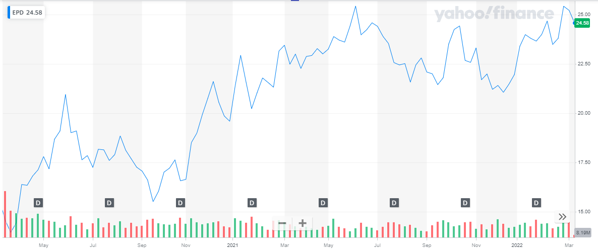 Enterprise Products has a market capitalization of $53.5 billion. The share of the company is currently trading at a price of $24.58. The company’s share despite experiencing volatility has maintained its upward streak for the past two years. In the year 2021, the stock started off at a price of $19.59 and after appreciating by 12% concluded the year at $21.96. During the current year, the share appreciated by 12% year-to-date.