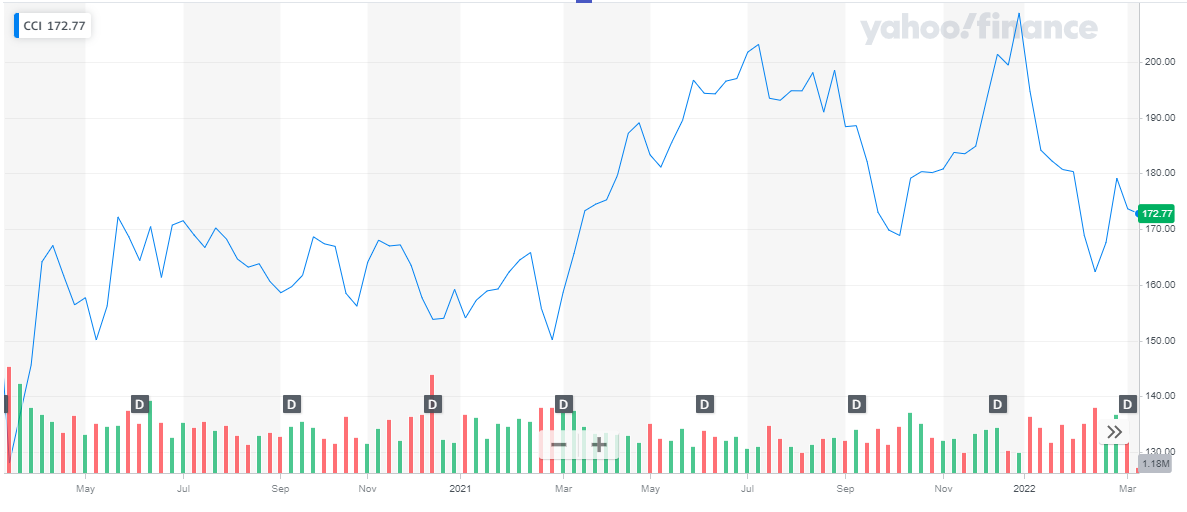 Crown Castle has a market capitalization of over $75 billion. The company’s stock is currently trading at a price of $172.77. the stock of the company has exhibited high volatility in the past two years. The stock started the year 2021 at a price of $159.19 and concluded at a price of $208.74, representing an appreciation of approx. 31%. During the current year, the stock has experienced a huge dip in price and has depreciated by 17% year-to-date.