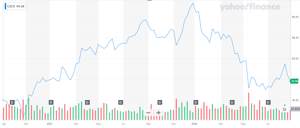 Cisco Systems has a market cap of $ 184.6 billion. Its share is trading at a price of $ 44.59.